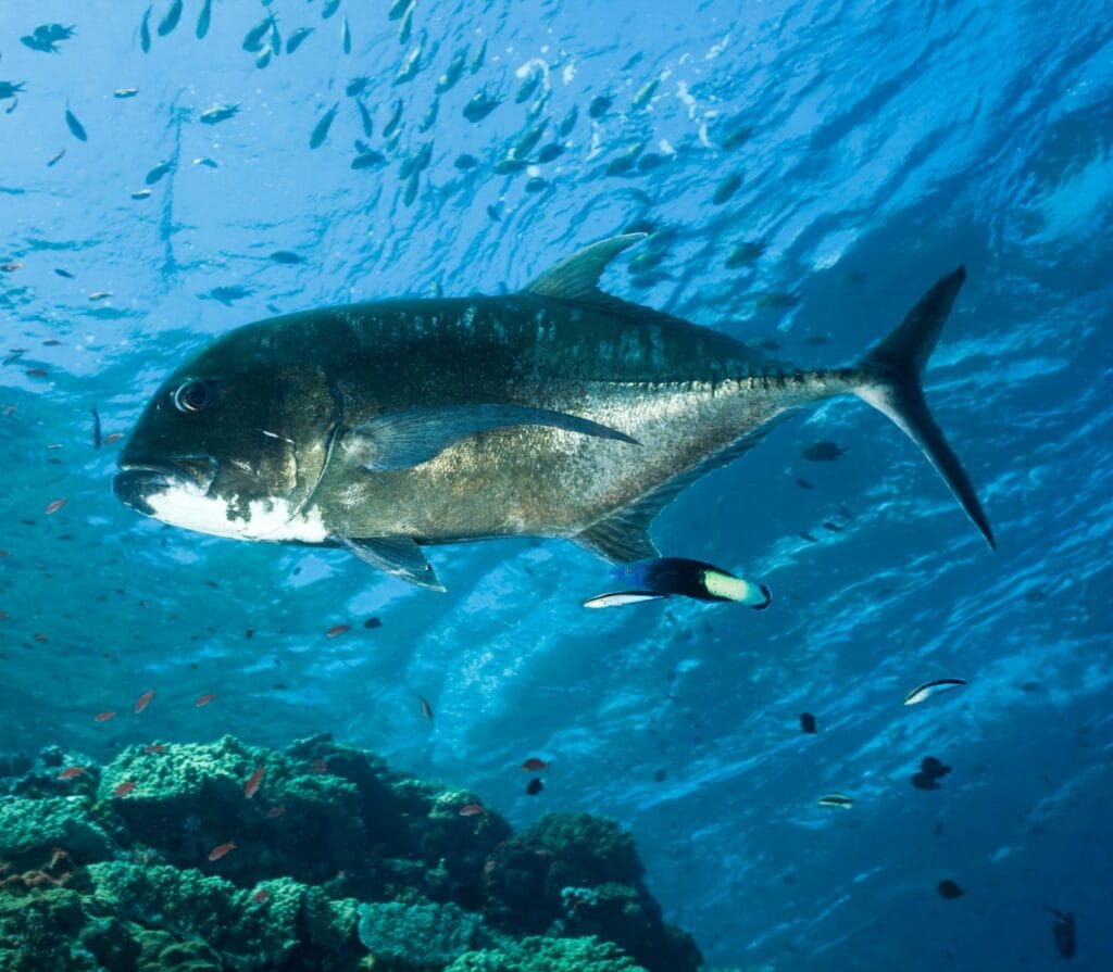 The “Shotgun” channel is fast, with currents up to 8 knots. Divers are swept through by giant trevallies. The dive has three zones: