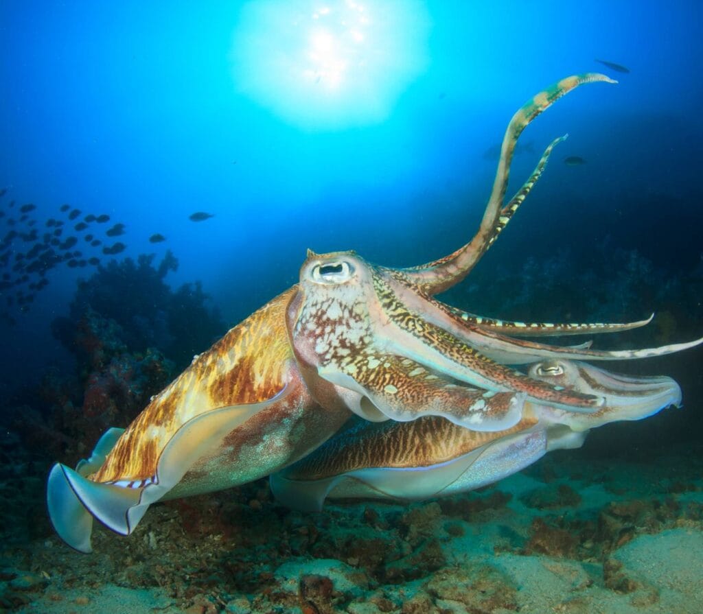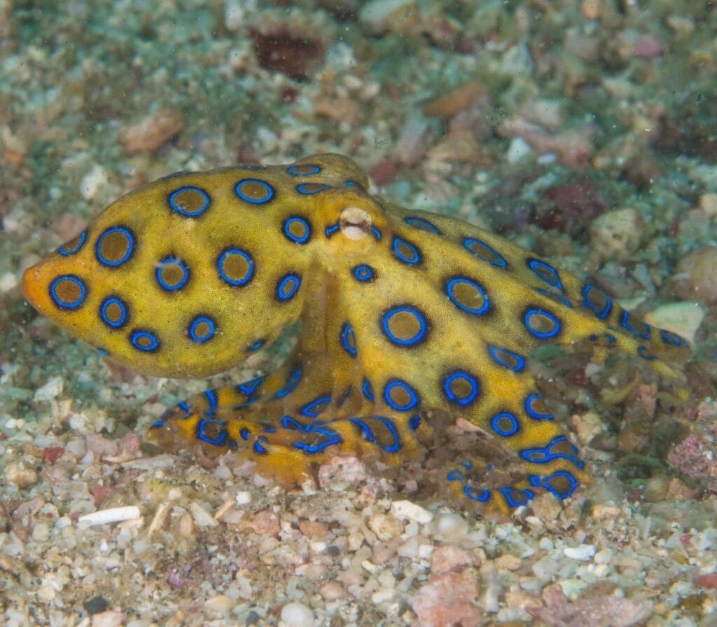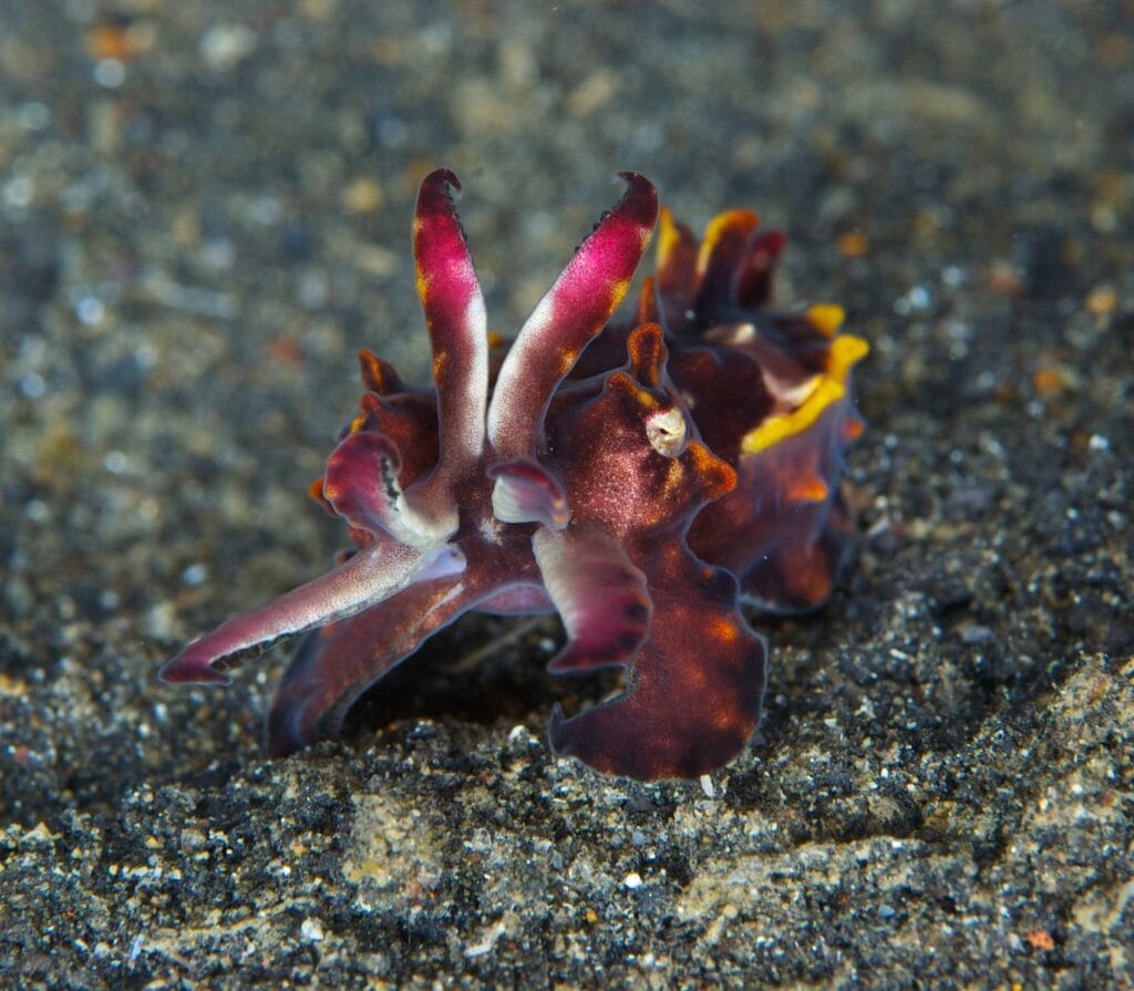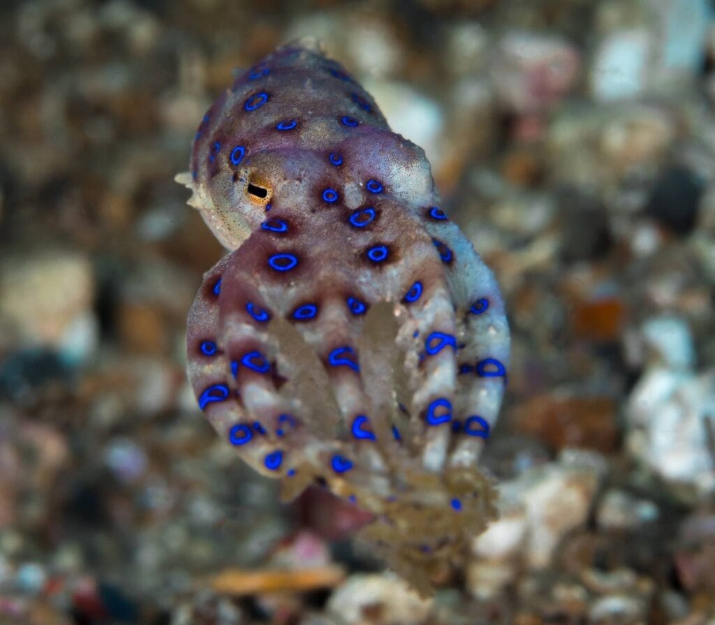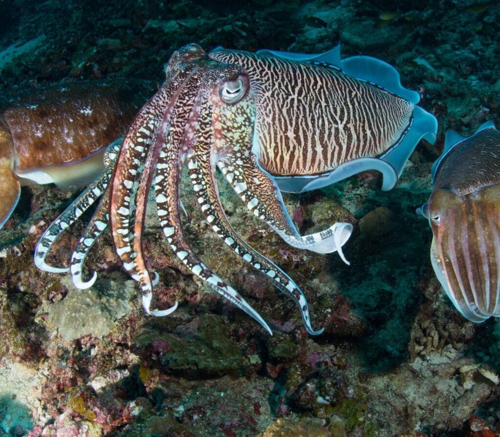 At Gili Poh, black rock fingers reach up to the surface. It’s a great place for spotting macro life. Divers can see Hippocampus bargibanti (pygmy seahorses) on sea fans in bright colors. Night dives are amazing here. You might see blue-ringed octopuses hunting on the reef. The depth here is great for all divers. The eastern slope has Halimeda algae fields. During mating season, cuttlefish show off their color-changing tricks.