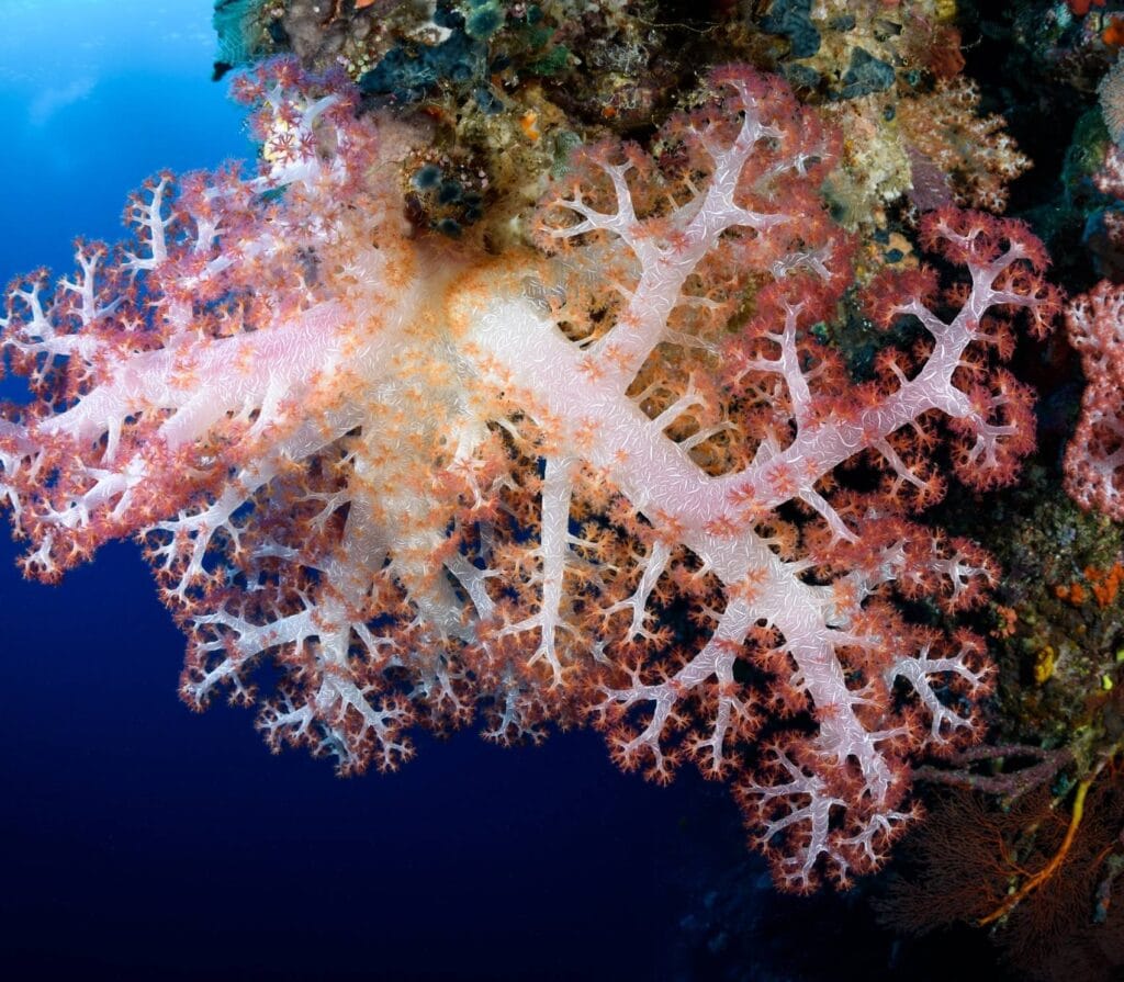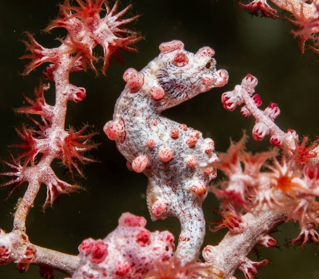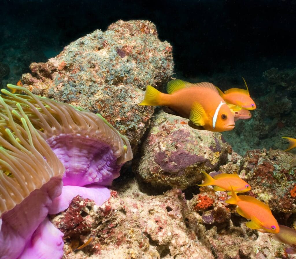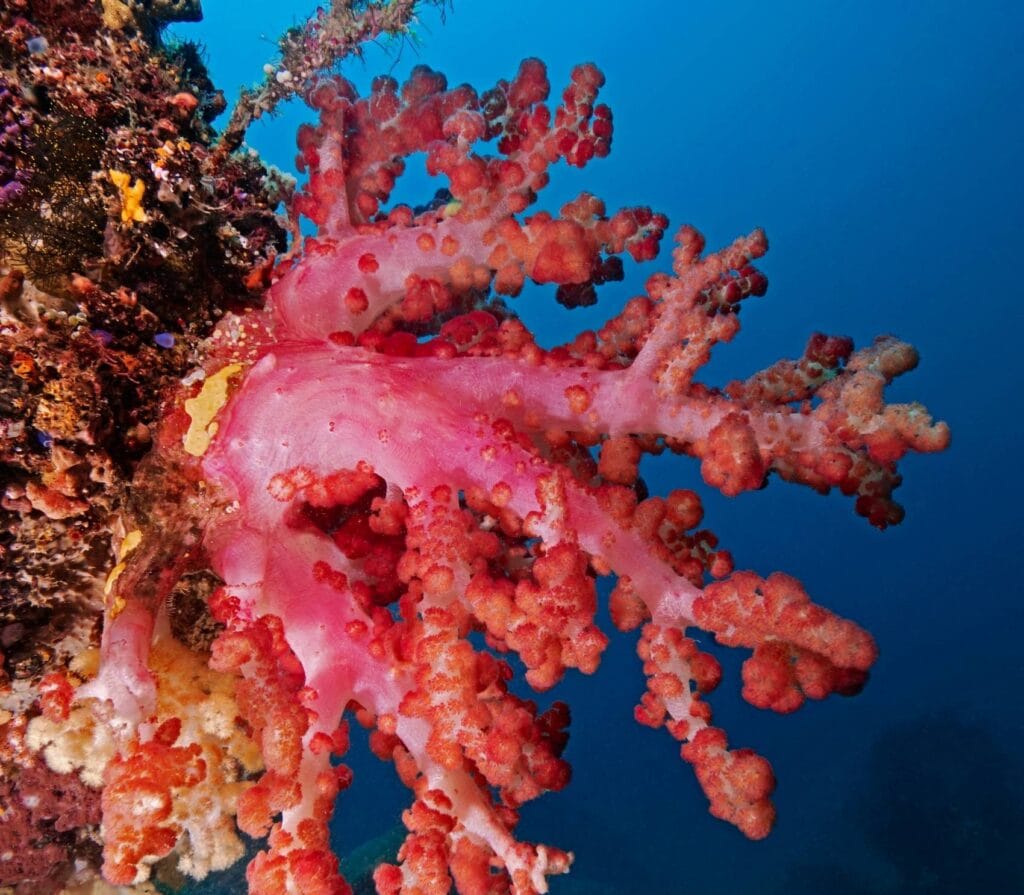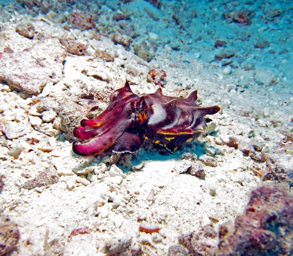 The main attraction here isn’t just the beach’s color, it’s the thriving coral gardens 15-30m below. Schools of fusiliers dart through table corals shaped like giant lily pads. Blacktip reef sharks patrol the outer edges. Night dives reveal a transformed world where Spanish dancers glide across the pink-tinged sand.