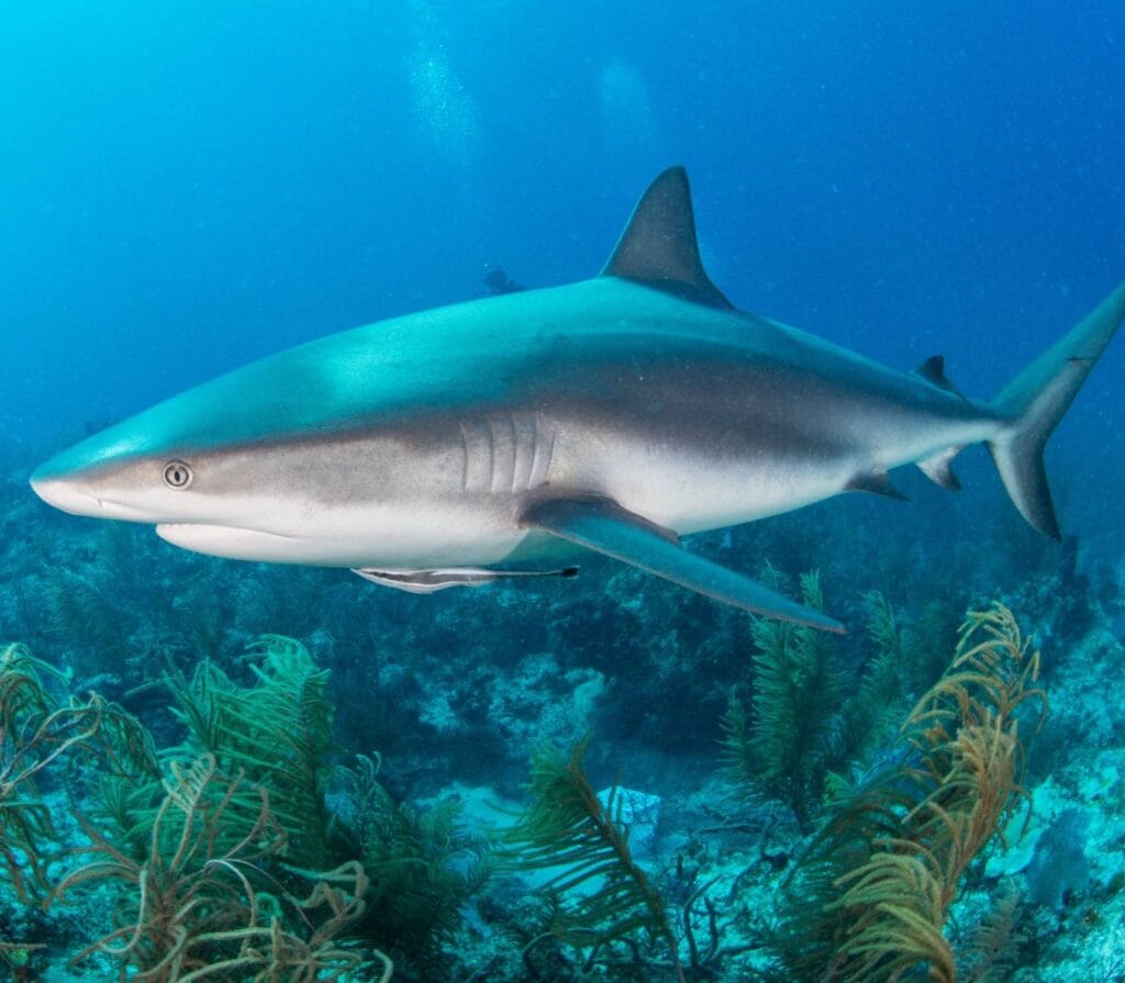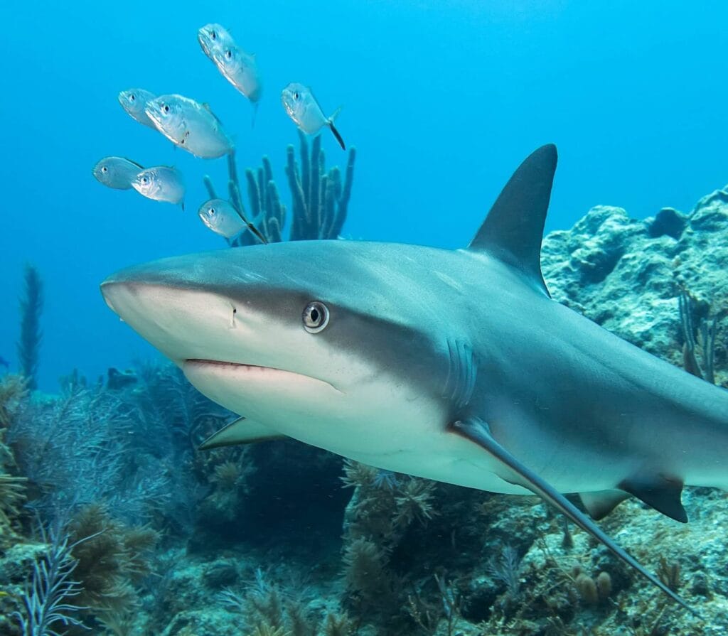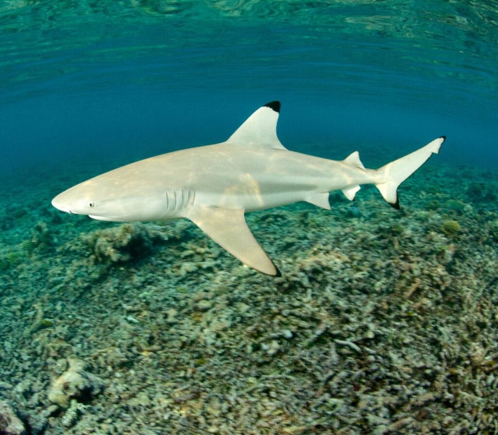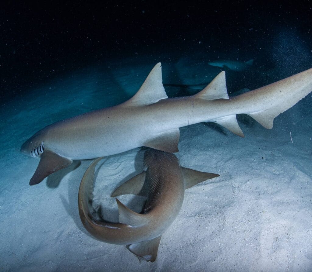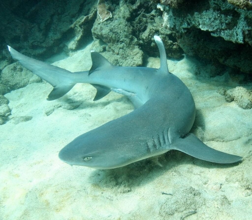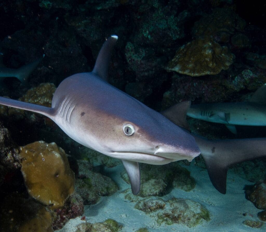 At 18m, you’ll see white tip reef sharks in sandy “aquatic highways” with sea fans. The site’s slope makes it easy to watch these sharks. Morning dives might show you mating octopuses, adding drama to the shark show.