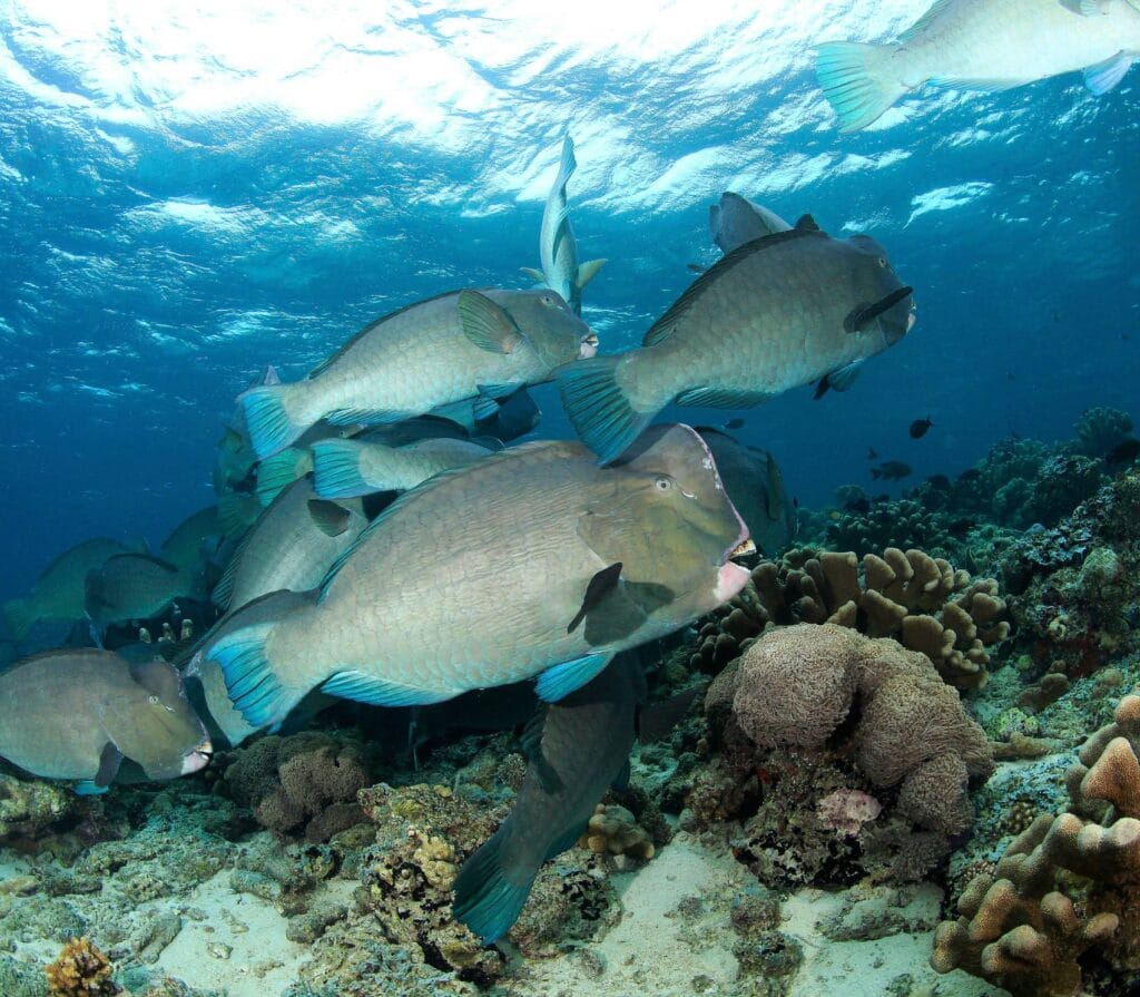 Time your dive for twilight to see garden eels in the current. Bumphead parrotfish feed on coral at sunset. This site is great for all levels, with stunning light shows from the west.