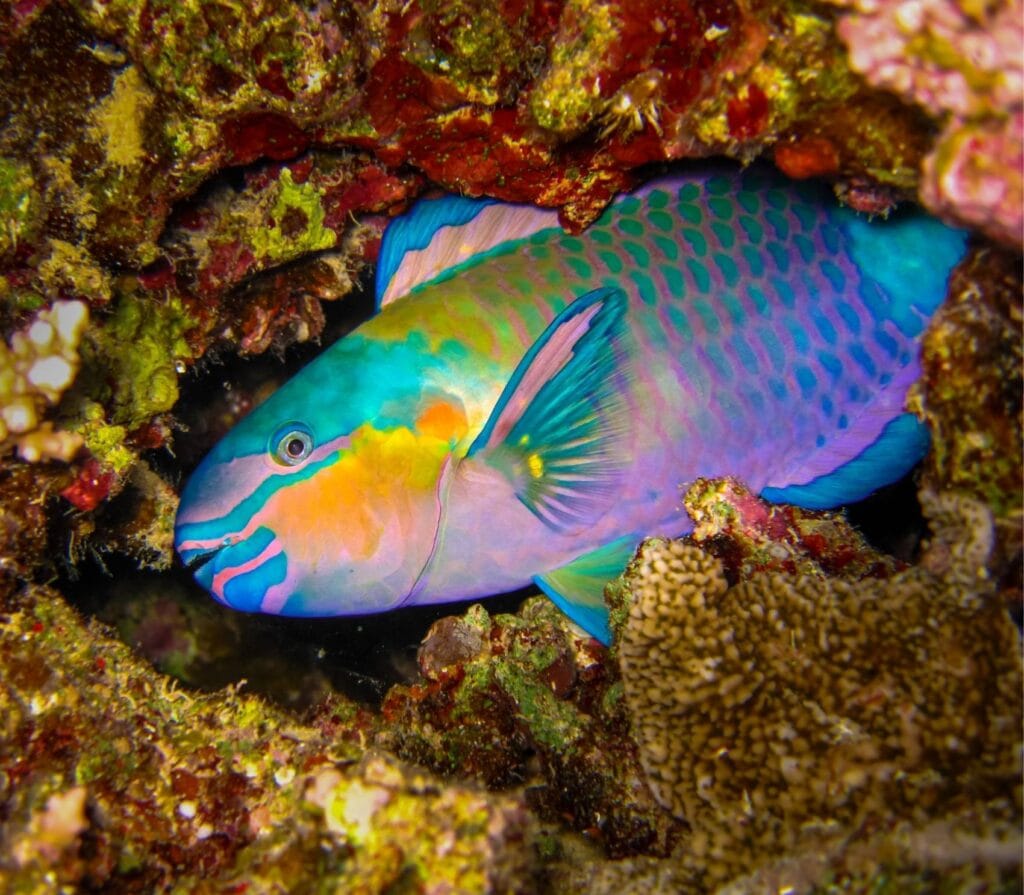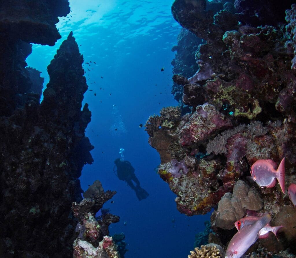 The Labyrinth is for the more experienced divers. It’s a network of lava tubes filled with soft corals. You’ll see batfish and sometimes manta rays. We plan dives when the tide is right. This way, you can safely explore this underwater wonder.