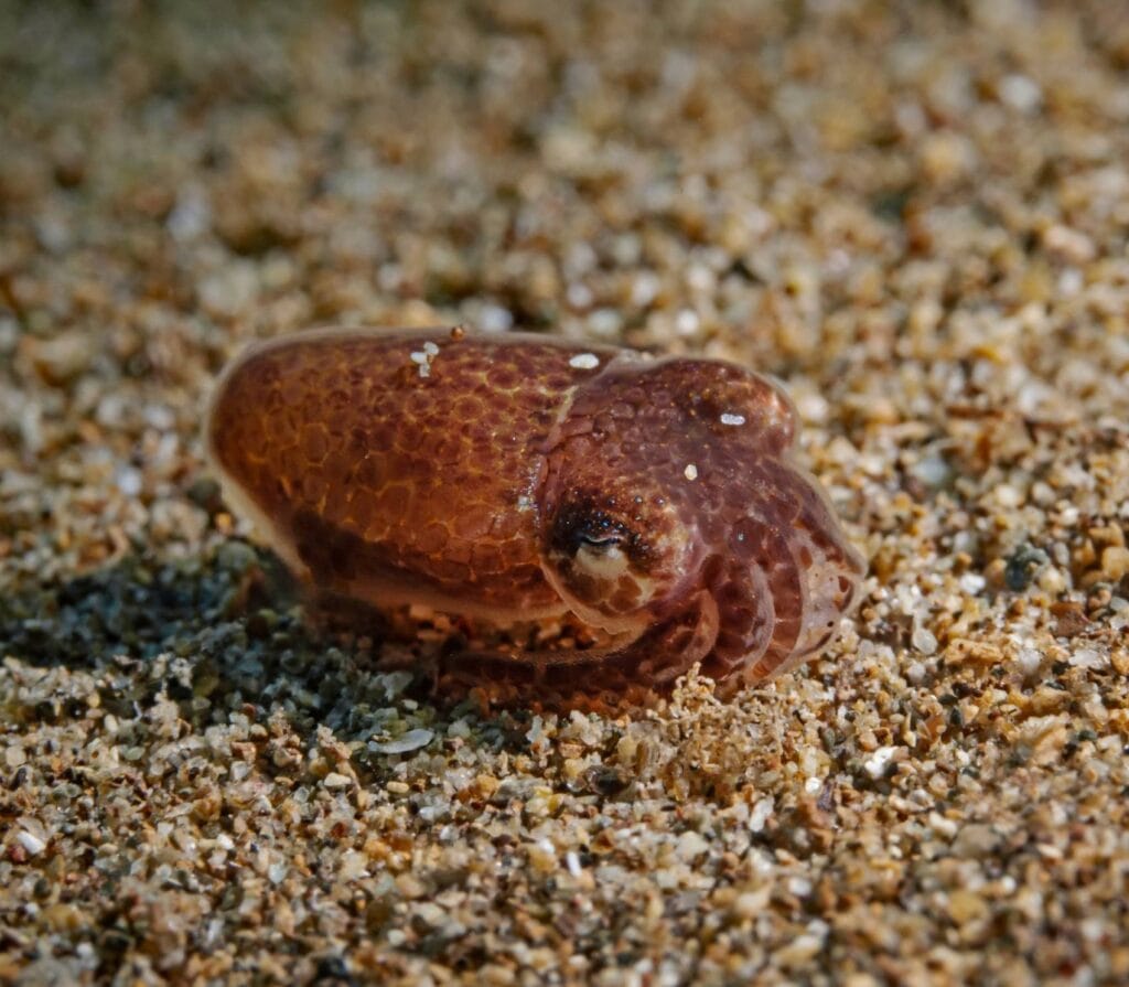 At night, Lazy Wave transforms into a magical underwater scene where glowing comb jellies shimmer like stars, colorful mandarinfish perform their dusk-time dance, and tiny bobtail squid glide through the dark, lighting up as they hunt, making it an ideal spot for beginners to experience the wonders of night diving.