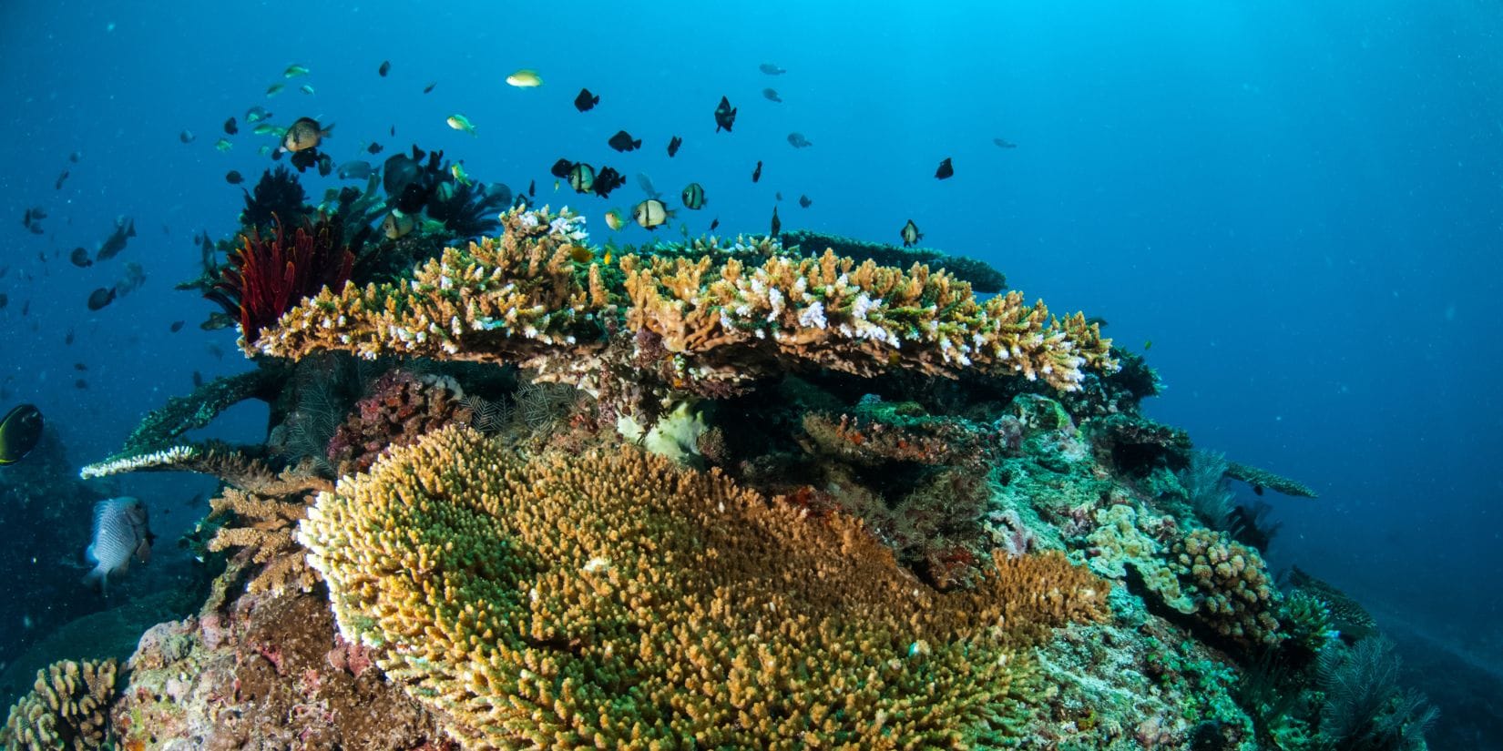 Drift over a plateau with fusiliers and table corals. The reef drops to 40 meters, attracting reef sharks.